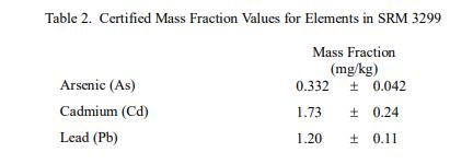 表 1 和表 2 提供了 SRM 3299 中姜黃素和元素的認證質量分數(shù)值,以干質量為基礎報告。NIST 認證值是 NIST 對其準確度有最高置信度的值因為所有已知或可疑的偏見來源都已被調查或采取考慮[1]。價值分配分析由 NIST 和合作實驗室進行。認證值計算為 NIST 方法平均值的未加權平均值和合作實驗室平均值的加權中值(在適當?shù)那闆r下)。相關的不確定性以大約 95% 的置信水平表示 [2-4]。