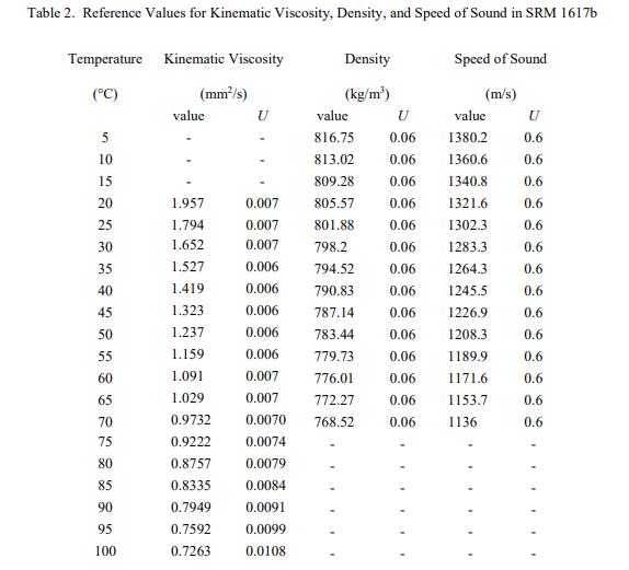 表 2 給出了 SRM 1617b 的運動粘度、聲速和密度的參考值。NIST 參考值是未經認證的值,它是基于可用數據對真實值的最佳估計;但是,該值不符合 NIST 認證標準 [3],并提供了相關的